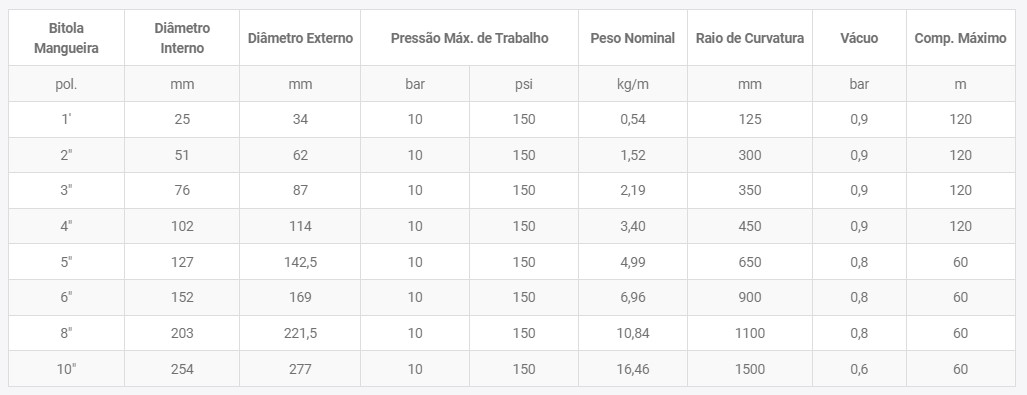 Aplicação: Mangueira de parede rígida para sucção e descarga de água e fluidos não corrosivos. Adequado para amplo raio de curvatura e aplicações não muito pesadas;